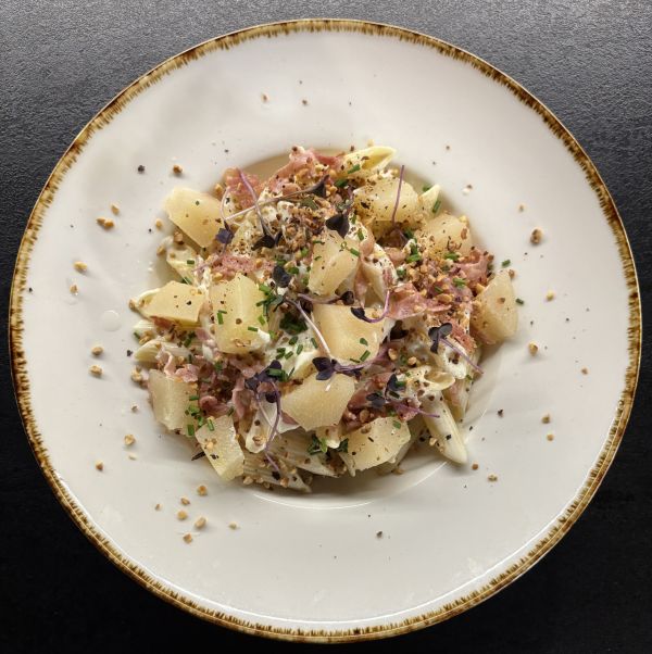 Penne s hráškovou omáčkou s guanciale amatriciana, bazalkou a Grana Padano DOP