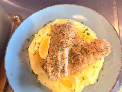 Grilovaný filet z pražmy královské na másle s kapary a citrónovou šťávou, šťouchané brambory s petrželkou