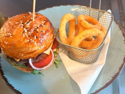 140 g Hovězí burger se slaninou a čedarem, belgické hranolky