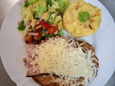 Menu 1. 150g Smažený kuřecí řízek, šťouchaný brambor 1/1, 3, 7