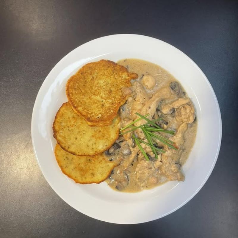 170g KUŘECÍ PRSÍČKO NA GRILU, smetanová omáčka se žampióny, bramborák
