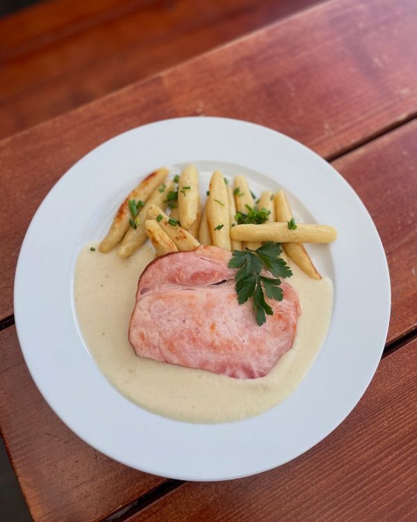 Moravský vrabec na smetanovém špenátu, domácí bramborový knedlík (150g) 137
