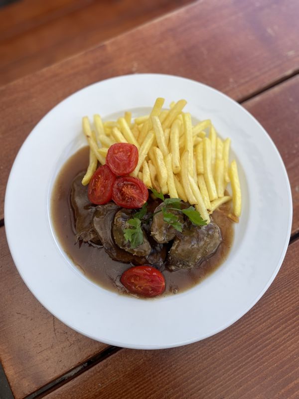 180g TELECÍ JÁTRA NA GRILU, domácí hranolky, tatarská omáčka