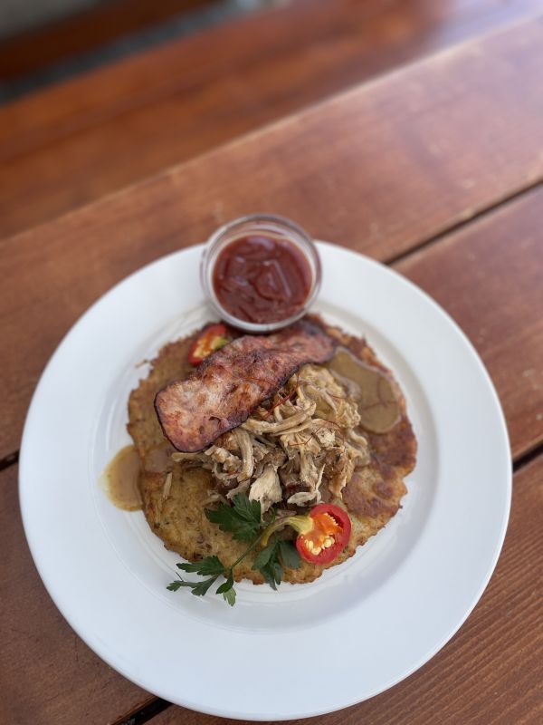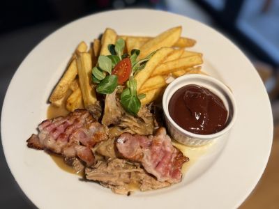 Sekaný vepřový biftek na cibulovém chutney s restovanou anglickou slaninou a sázeným vejcem, opékaný brambor (* bezlepkové,3,7)