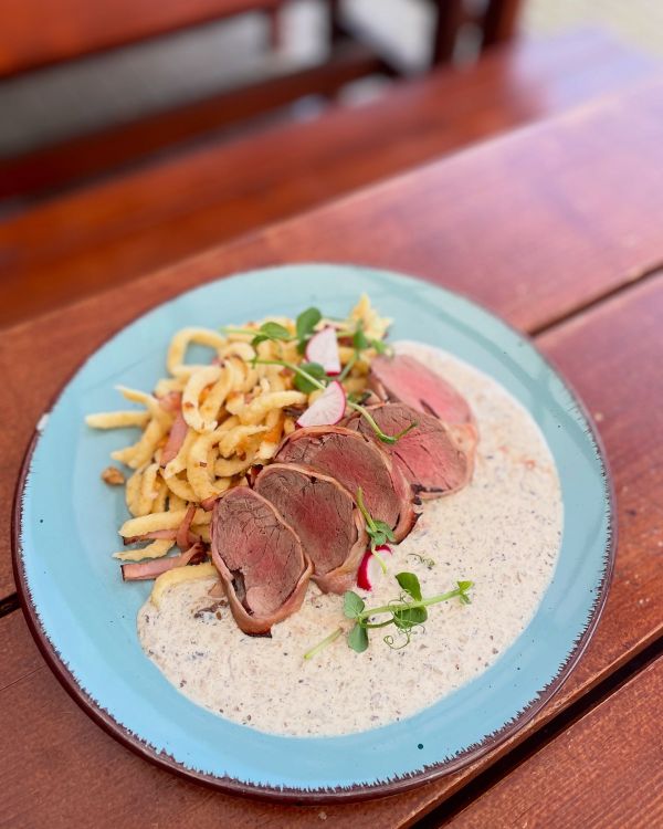 Hovězí svíčková na smetaně (hovězí, uz. slanina, brusinky, šlehačka), houskový knedlík (* 1,3,7,9,10)