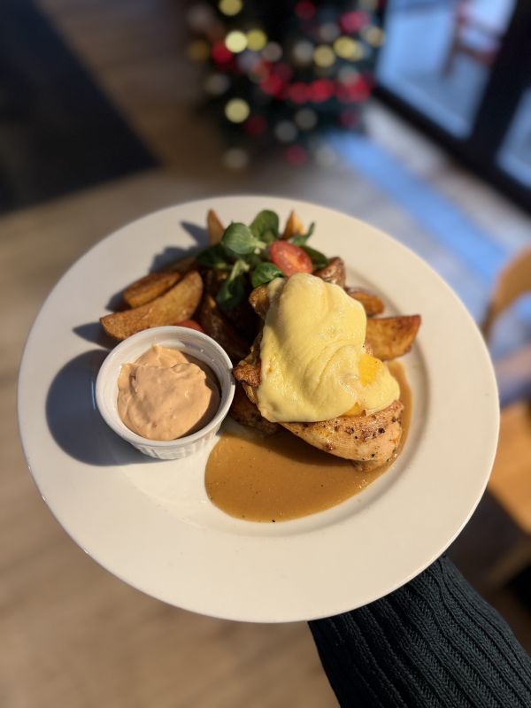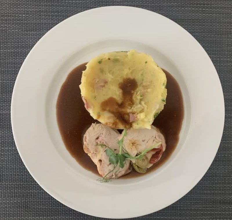 Přírodní KUŘECÍ ZÁVITEK v anglické slanině, plněný sýrem, BRAMBOROVÁ kaše, SALÁTek150g