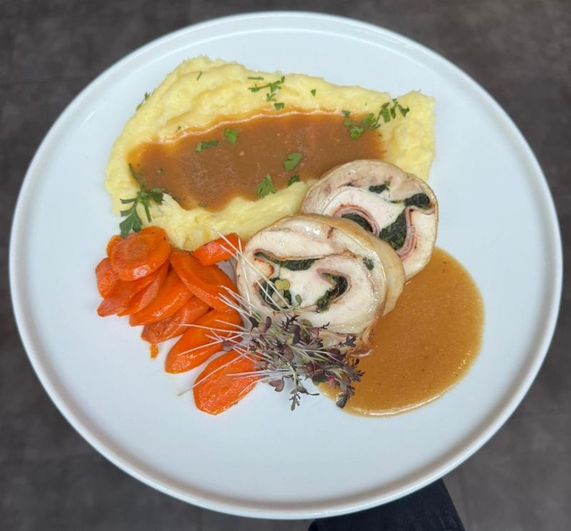 150g Špikovaná vepřová pečeně, špenát, bramborová roláda 1, 3, 7