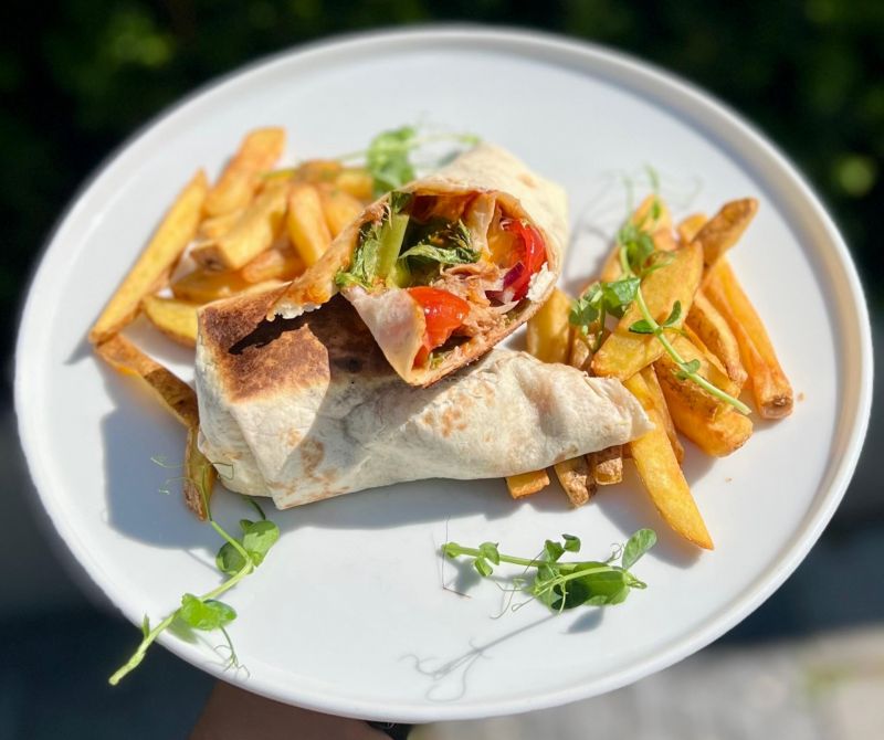 Burrito s trhaným hovězím cheddar, grilovaná cibule, paprika, špenát, rajčatová salsa, paprikový dip Al. 17910