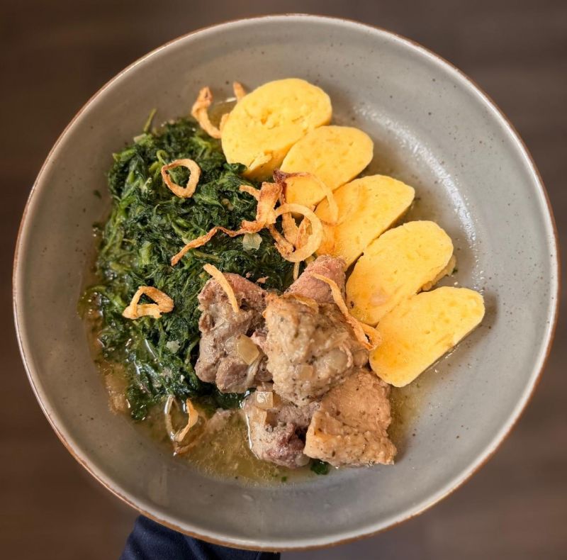 150g Pečená krkovice, špenát, bramborové šišky