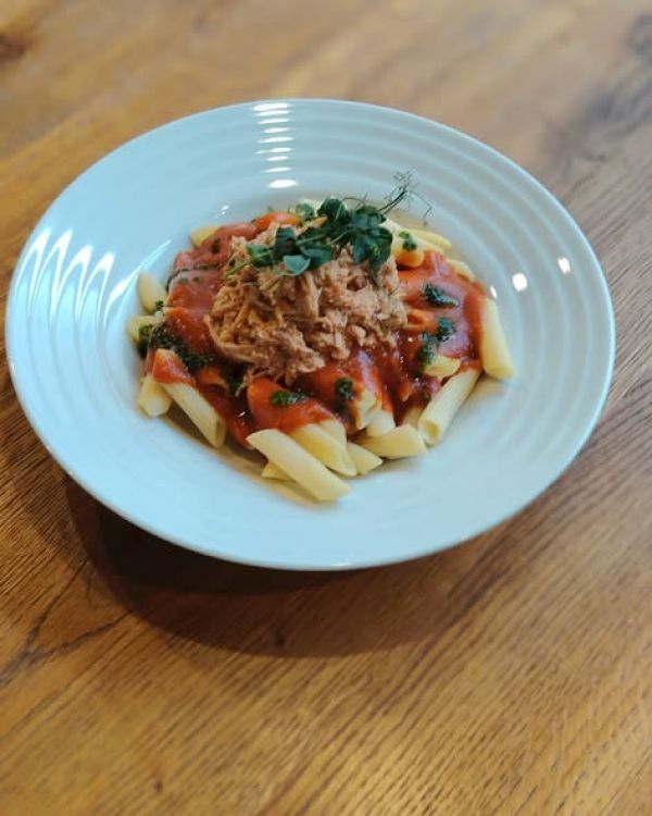150g Penne s rajskou omáčkou, trhané kuřecí maso 1a, 3, 9