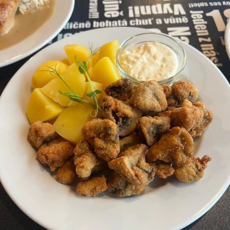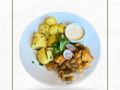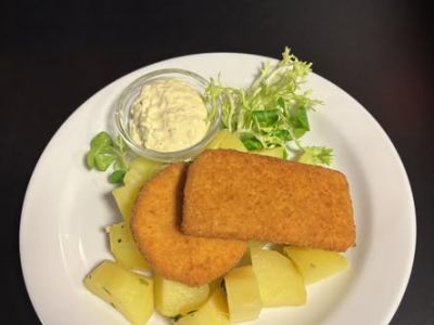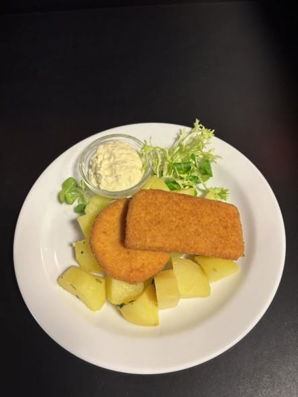 Smažený sýr (Gouda 48%) vařený brambor, domácí tatarka (* vegetariánské,1,3,7)