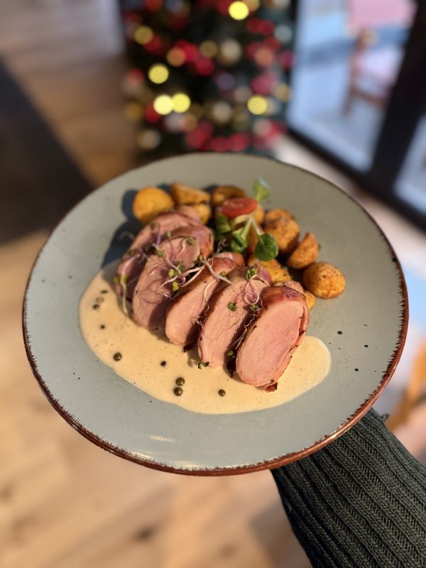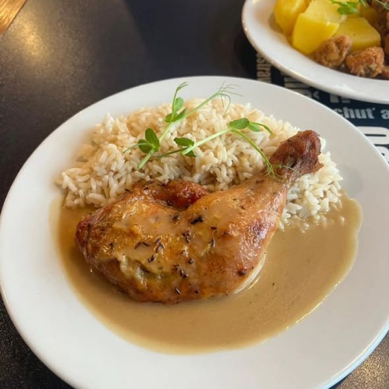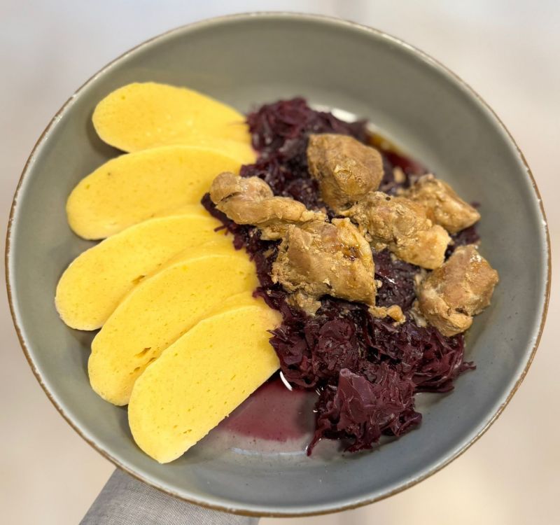Pečená dančí kýta s šípkovou omáčkou, houskový knedlík (* 1,3,7,9,10)