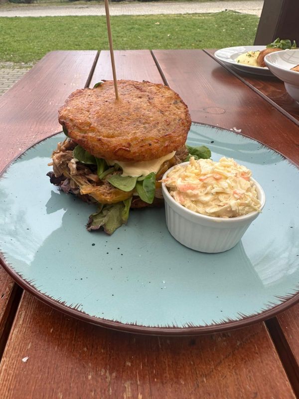 • Hovězí burger (čedar, rajče, okurek, led. salát) v naší housce, hranolky