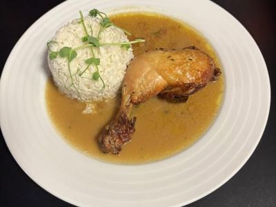 Kuřecí špalíky na černém pivu se šunkovou rýží a broskv. kompotem 1,7