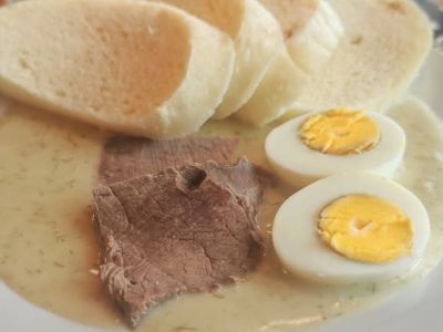• Dušené hovězí, koprová omáčka, houskový knedlík