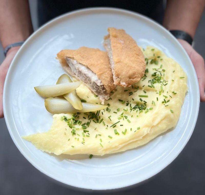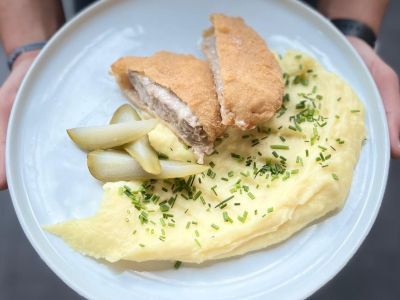 Smažený vepřový řízek v parmazánové strouhance, bramborová kaše, kyselý okurek