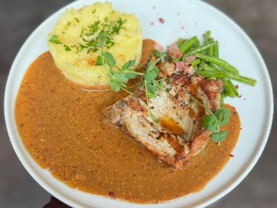 Filírovaná vepřová panenka, opékané brambory, pepřová omáčka se smetanou