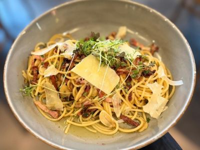 Špagety aglio olio s kuřecím masem, limetkovo-smetanová omáčka