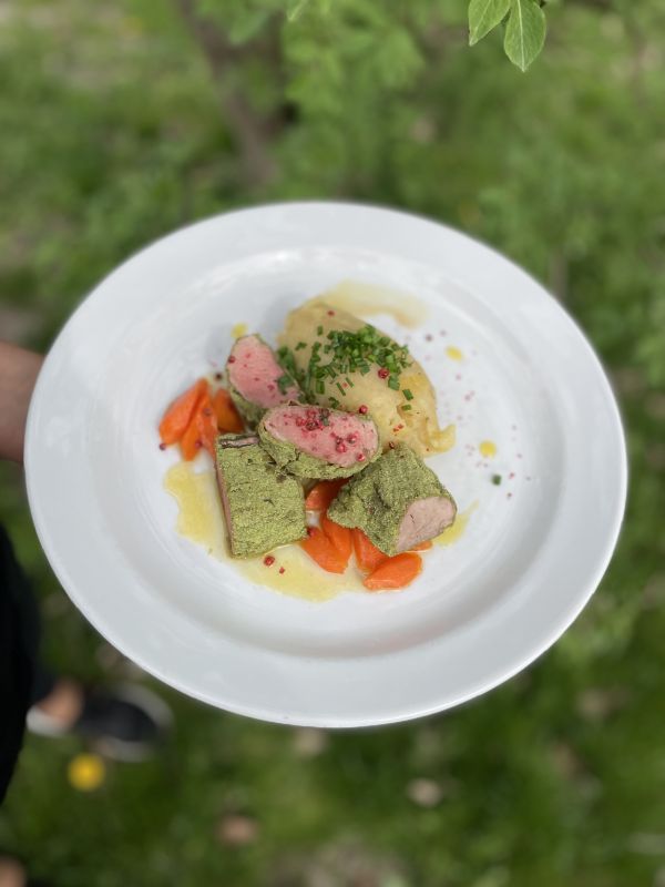 200g Kachní prsíčko pečené dorůžova s našimi bylinkovými kroketkami a slaninovou omáčkou, zdobené mikrobylinkami 1379