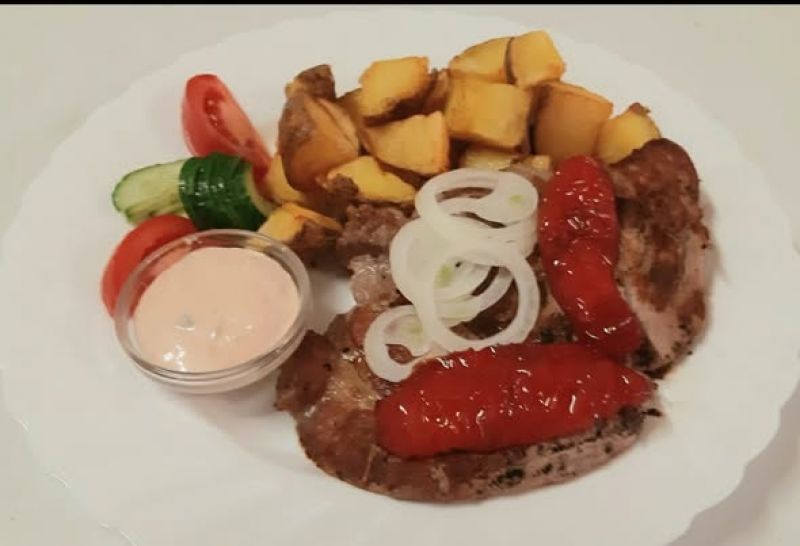 Vepřový steak na drceném pepři, příloha