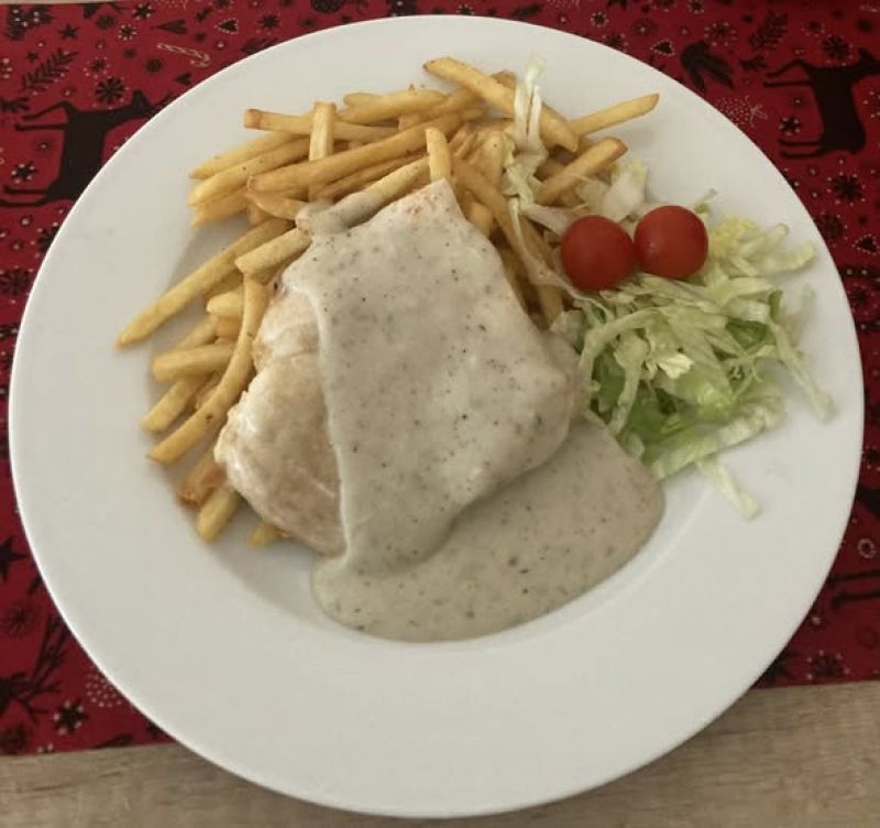 Kuřecí steak obalený v anglické slanině, hranolky, tatarská omáčka 1710