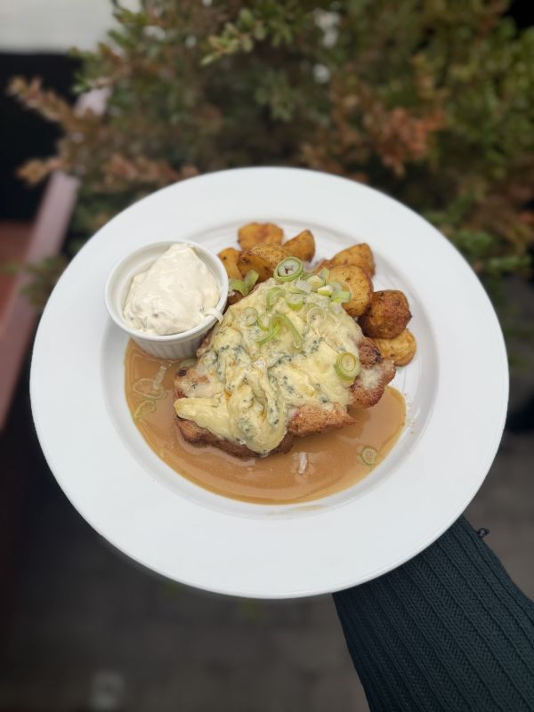 Holandský řízek s kousky goudy a čedaru, vařené brambory s petrželkou, tatarská omáčka