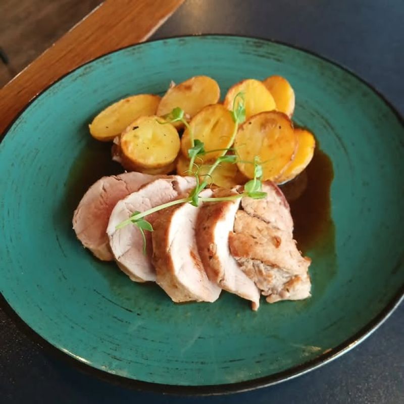 200g … Váleček z vepřové panenky, vinná omáčka, šťouchané brambory …
