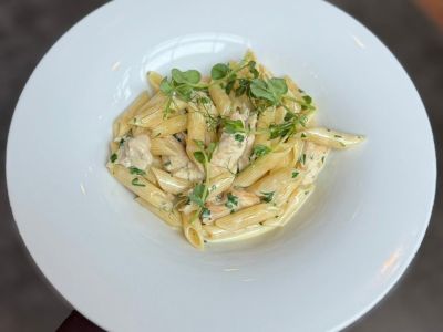 Špagety aglio olio s kuřecím masem, limetkovo-smetanová omáčka