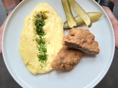 250g Smažený vepřový řízek, šťouchané brambory se slaninou a cibulkou, okurkový salát se smetanou 1a, 3, 7, 9