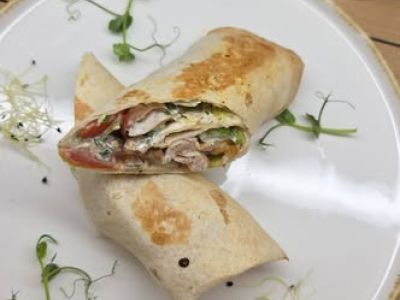 Tortilla s kuřecími prsíčky, zeleninou a sýrem, salát