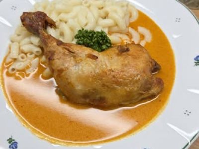 Kachní stehno, červené + bílé zelí, houskový + bramborový knedlík 137