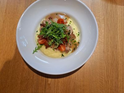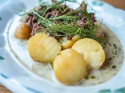 180g HOVĚZÍ LÍČKA NA VÍNĚ a ZELENINĚ, bramborová kaše, zeleninové čipsy a pickles