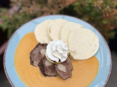 Domácí hovězí guláš, houskový knedlík nebo chléb