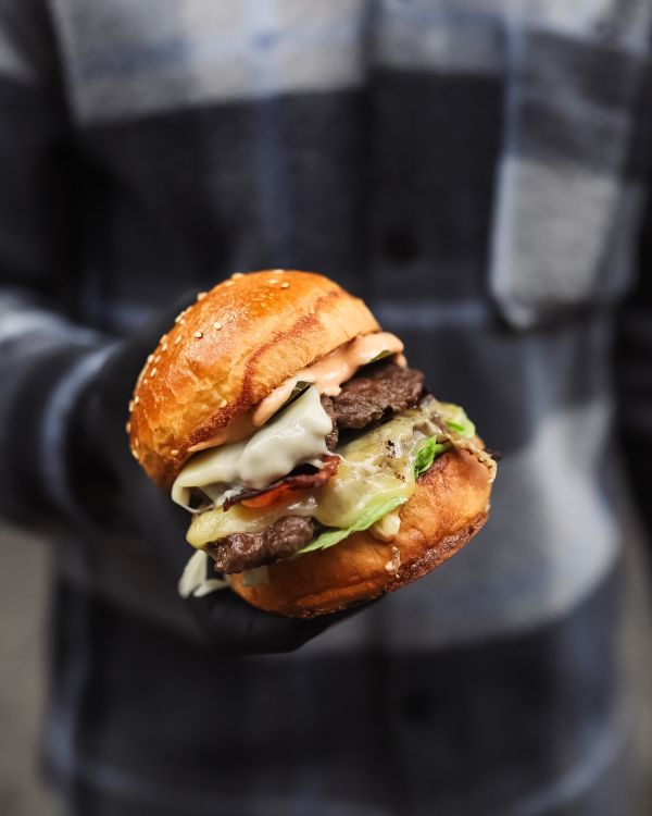 Hovězí Cibulka burger, cibulové chutney, čedar, slanina, americké brambory, pikantní dresink