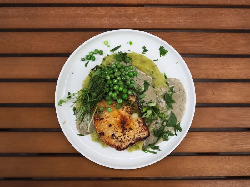 180g Grilovaný norský losos, grenaille s listovým špenátem a smetanou, pečený citrón