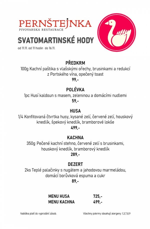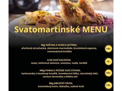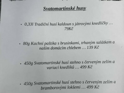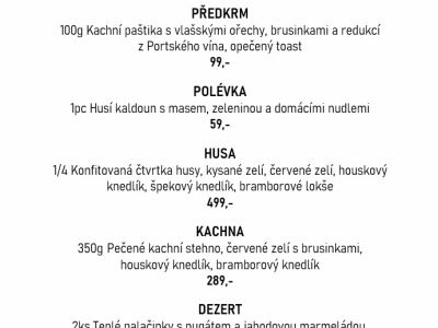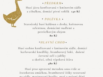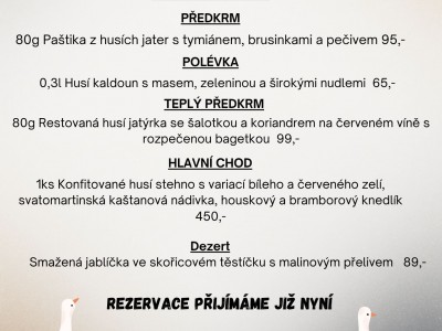 1/4 Pečená Husa s jablky a sušenými švestkami ¼ Pomalu pečené husy na rozmarýnu s kmínem, jablky a sušenými švestkami, dušené bílé a červené kysané soudkové zelí, silná výpeková šťava, Příloha: - Naše houskové a karlovarské k