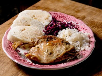 Konfitované husí stehno s variací bílého a červeného višňového zelí,,houskovým a bramborovým knedlíkem