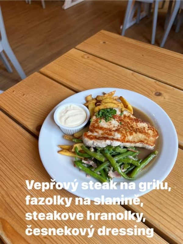 150g Vepřový steak na grilu zapečený hermelínem, hranolky