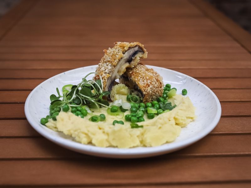 250g Pečené kuřecí stehno s máslovou nádivkou a hlívou ústřičnou, šťouchaný brambor s cibulkou, výpeková šťáva