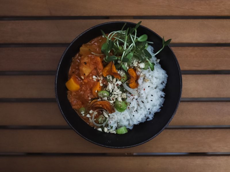 150g Indická tikka masala s kuřecím masem, kokosovým mlékem a zeleninou, dušená rýže Basmati, koriandr, jogurt (1,7,9,10)