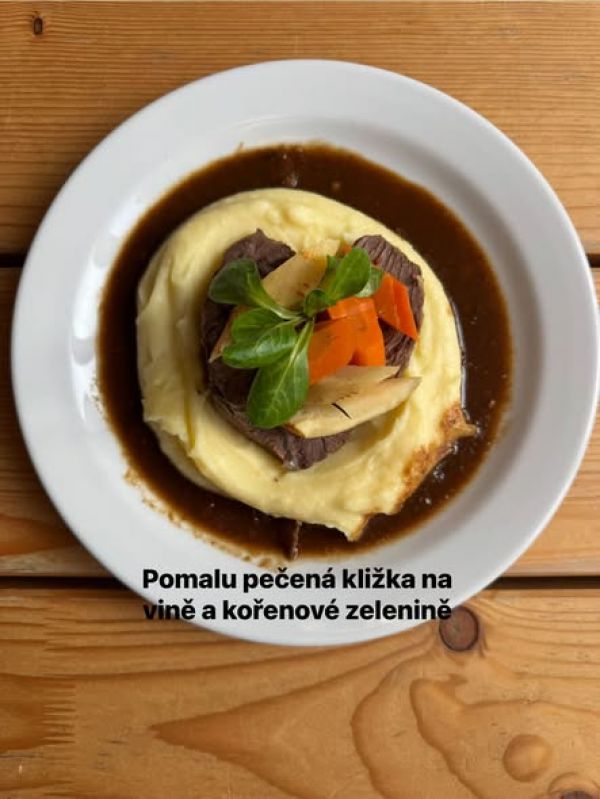 120g Hovězí maso na česneku, bramborové knedlíky plněné uzeným masem 167