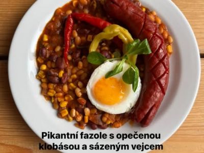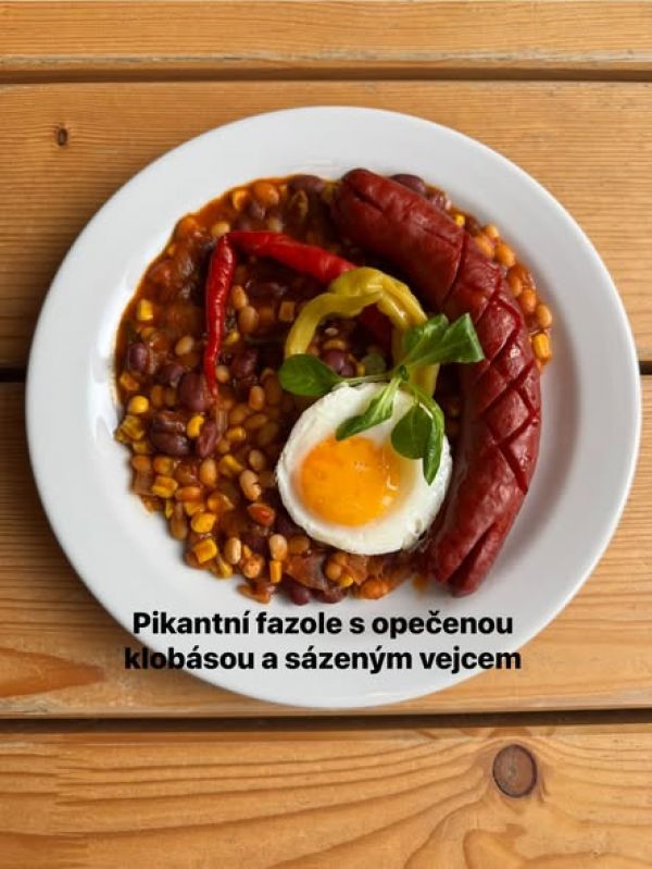 150g Vinná klobása pečená na černém pivu s cibulí, paprikou, česnekem a chilli, naše zelná čalamáda, pečené brambory ve slupce