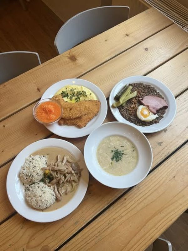 Červené kari - středně pikantní omáčka s batáty a mrkví podávaná s rýží nebo s hranolkami, jako hlavní složku možné vybrat kuřecí maso, tofu (vgn), norskou tresku nebo smažený květák v harissa omáčce (vgn, bzl)