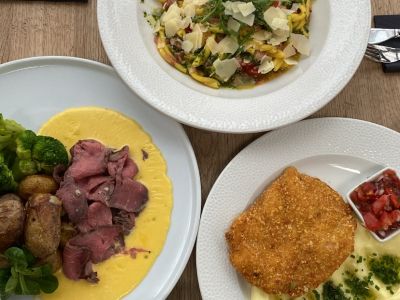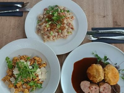 Krůtí steak, červená čočka se zeleninou, rukola (120g) 19