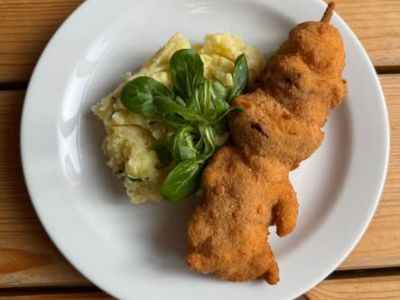 180g Smažená vinná klobása, vařené brambory, domácí tatarská omáčka 137