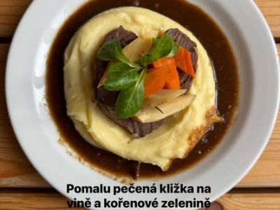 Špikovaná kýta z divočáka se šípkovou omáčkou a bramborovým knedlíkem (120g) 1379