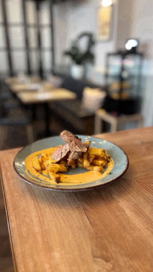 150g Vepřový steak na grilu, steakové hranolky, česnekový dip 36791013