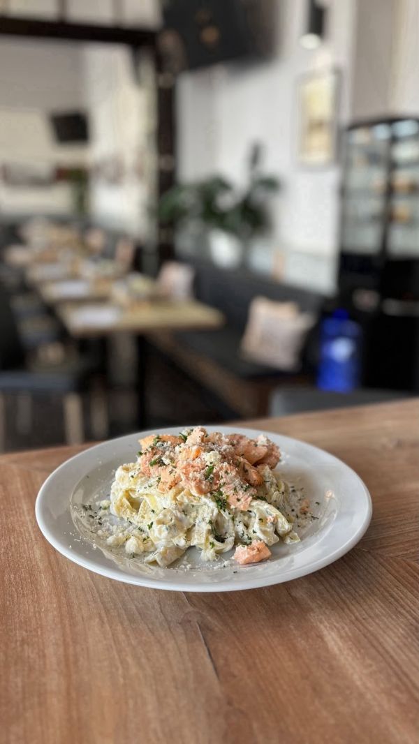 120/250g Semolinové tagliatelle s omáčkou z drcených a sušených rajčat, listový špenát, pečené kousky lososa, parmezán, rukola (1,3,4,9,11)