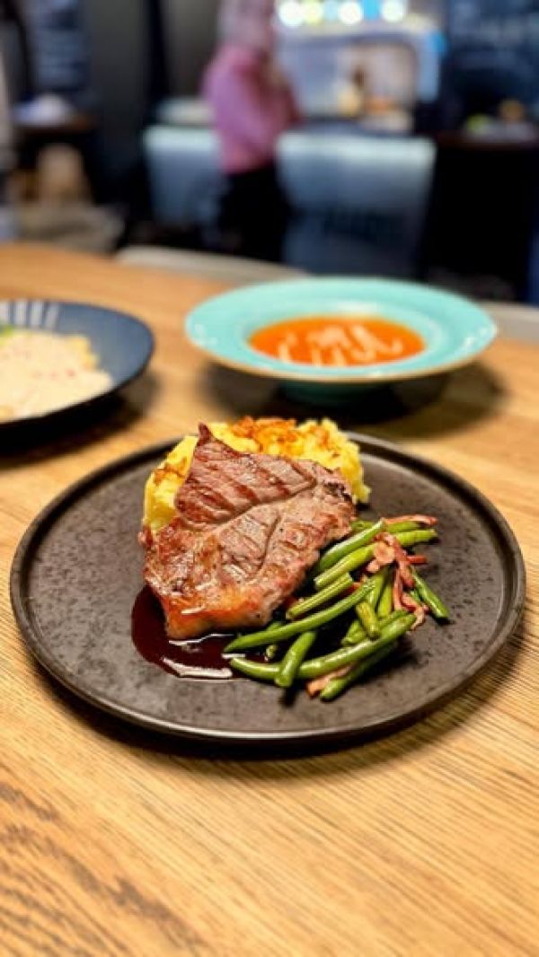 Grilovaný steak z vepřové kotlety, zelené fazolky, smetanovo-pepřová omáčka, pečené brambory grenaille bezlepkové, 7