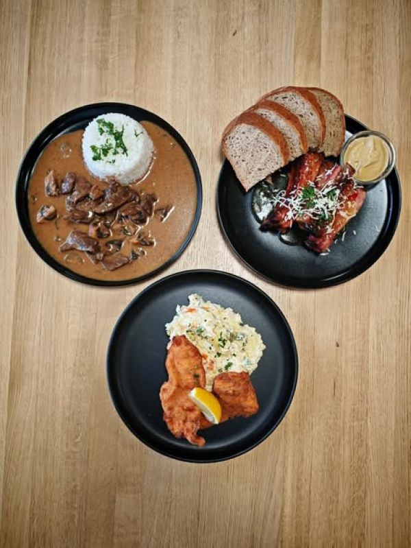 0, 3l Polévka, 120g Vepřové ledvinky na cibulce, rýže, Moučník 1